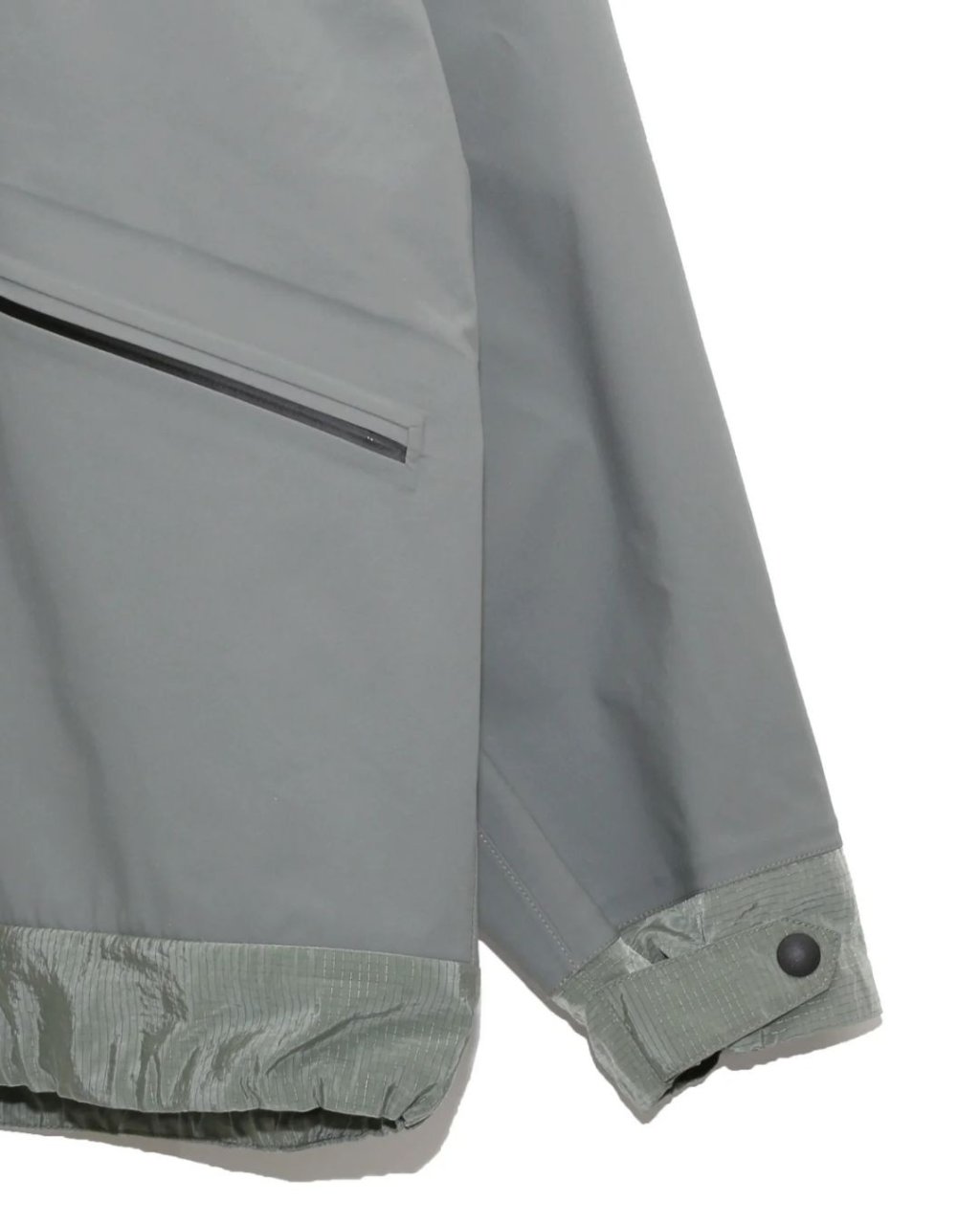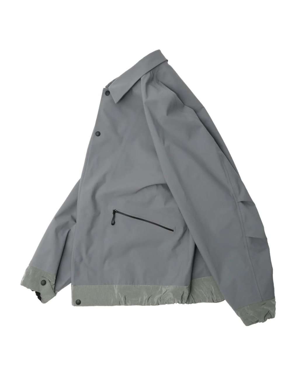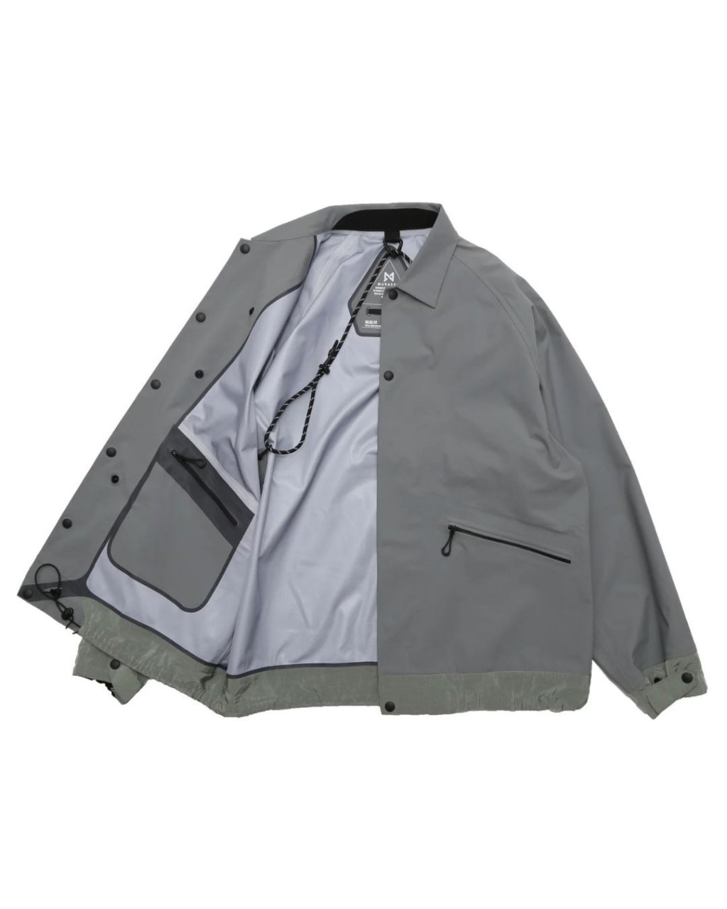 The MURASPO concept expresses the most standard coach jacket for action sports athletes during their off time.The main material is a 3-layer nylon stretch material that is water repellent, water resistant, and breathable.Nylon lip material, which is softer than the body material, is used around the wrists and hem to reduce stress on the skin.The back of the seams are taped and a waterproof zipper is used to ensure comfort even during the rainy season.The silhouette is designed with a large width to prevent stress even when layered, a front vertical windshield, and built-in suspenders.