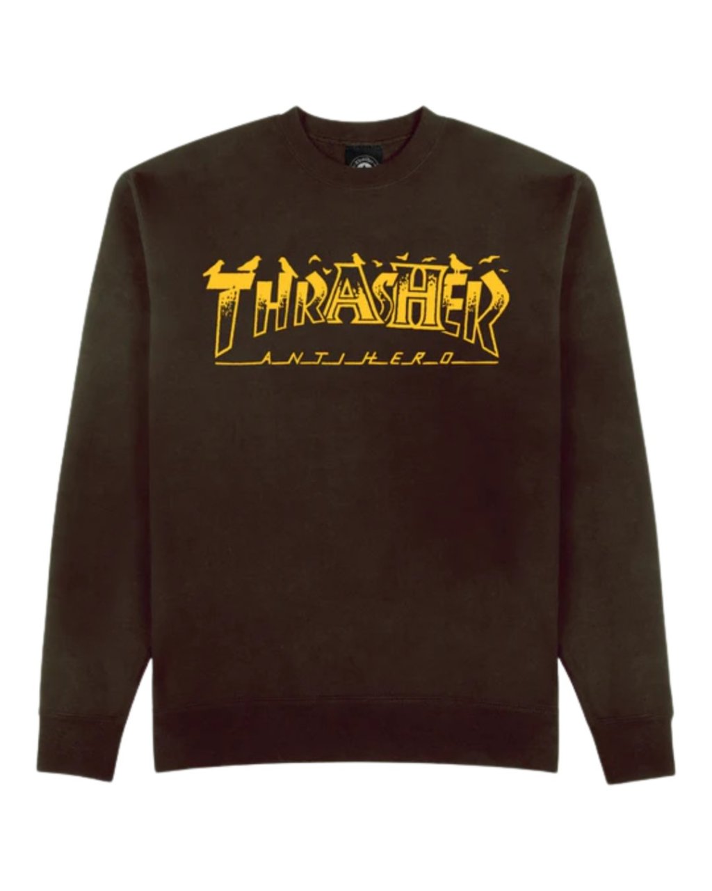 The Pigeon Mag crewneck sweatshirt from Thrasher and Anti-Hero comes in a dark brown colorway boasting a yellow screen-printed graphic across the chest. The screen-printed graphic on the front showcases "Thrasher" across the chest, substituting the "A" and "H" from the traditional font and replacing it with the Anti-Hero lettering. This comfortable crew neck has a soft brushed interior, a stitched woven brand label, and ribbed finishes along the collar, cuffs, and bottom hem.
