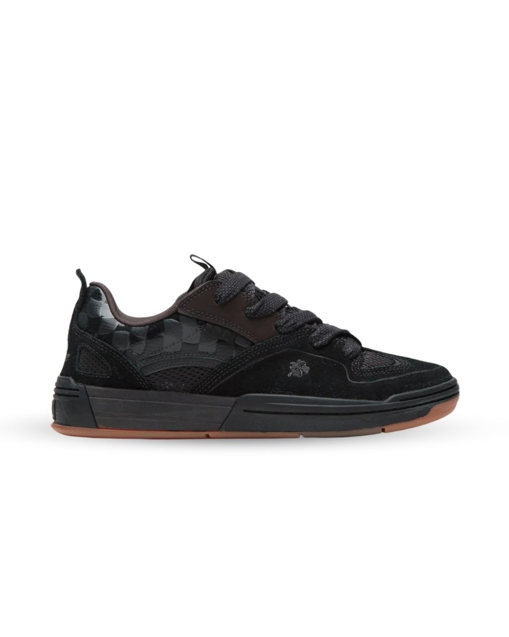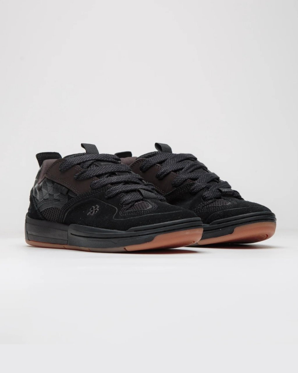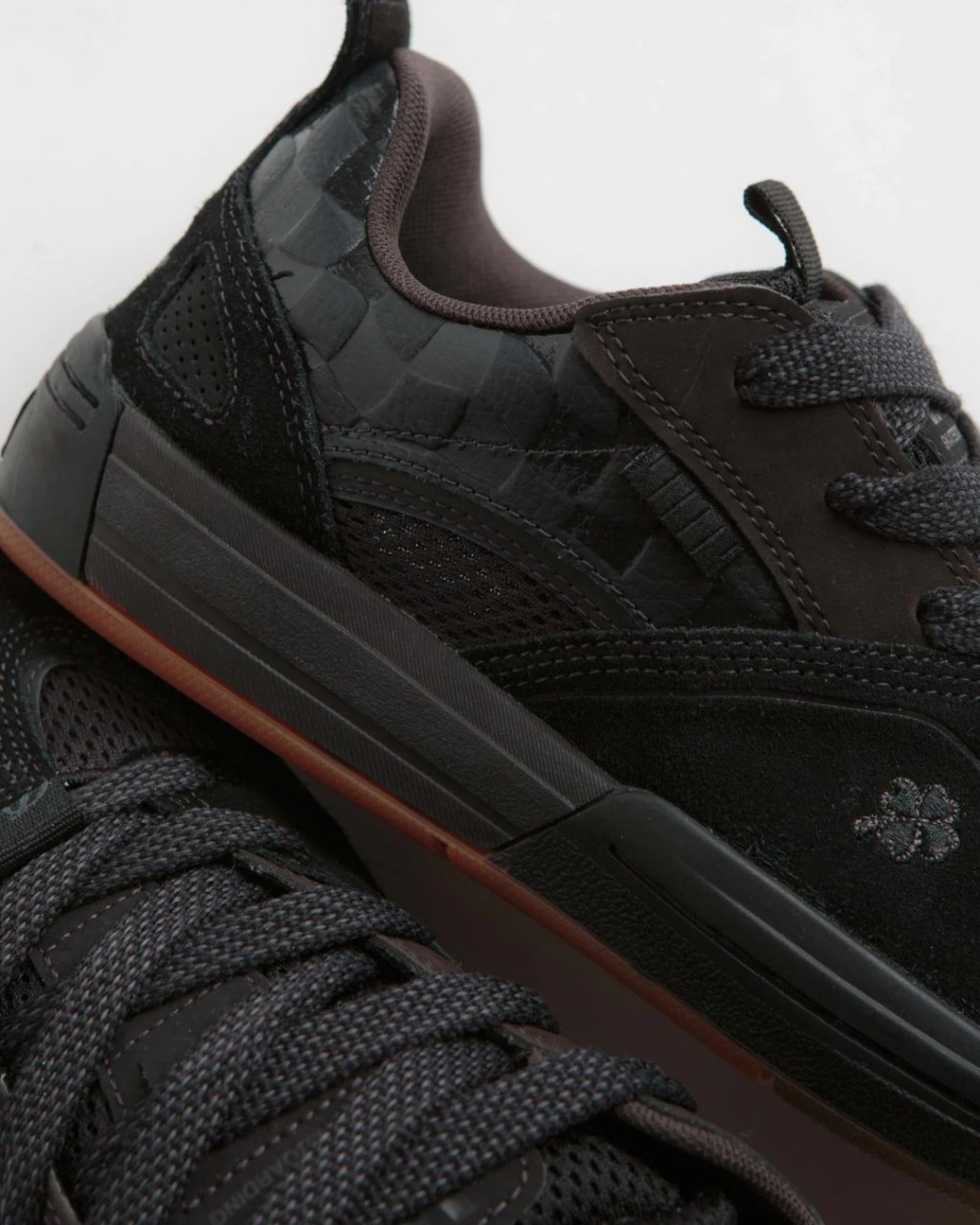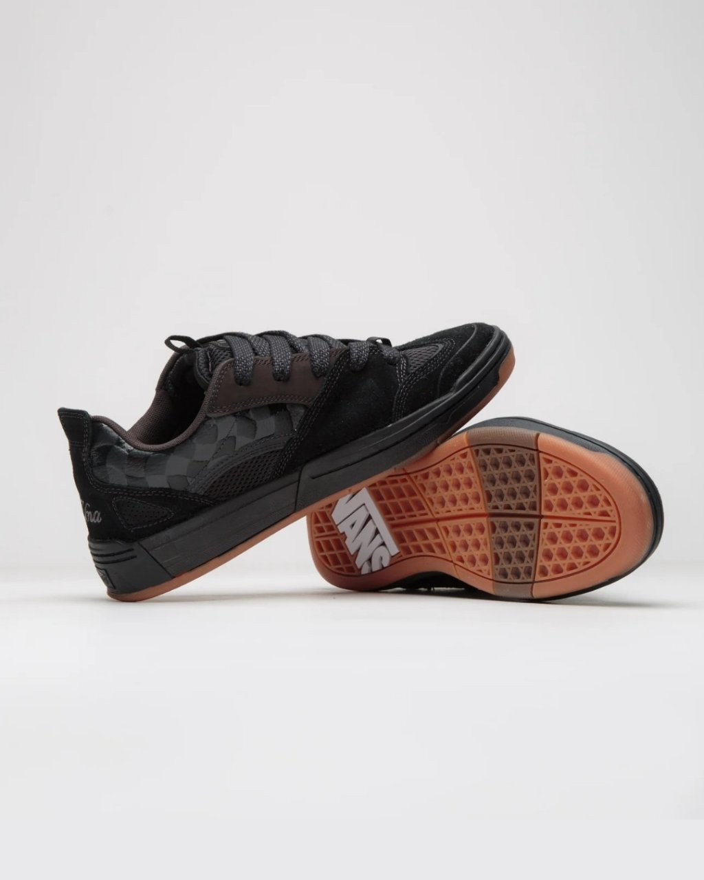 Vans Skate Mixxa Shoes Dime in Black and Grey. Inspired by classic ‘00s skate silhouettes and designed by skater Una Farrar, this Vans x Dime Skate Mixxa is styled with suede and mesh uppers with reinforced t-toe overlays and DURACAP™ rubber underlays. Featuring SickStick™ rubber compound, warped Vans checkerboard detailing and a custom lateral quarter clover, this black grey Vans Skate Mixxa is finished with embroidered Dime heel detailing, custom printed insoles, a stitch-on cupsole and a gum rubber outsole.