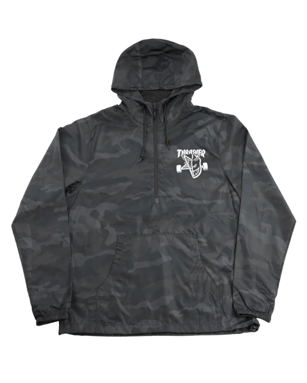 Lightweight Pullover Windbreaker Anorak Jacket has water resistant 100% polyester body fabric with a 1/2 front zipper, scuba neck, mesh lined 3 panel hood, and welt pockets. Sewn-in label at inner neck finished with Thrasher x Spitfire logo at left-chest.