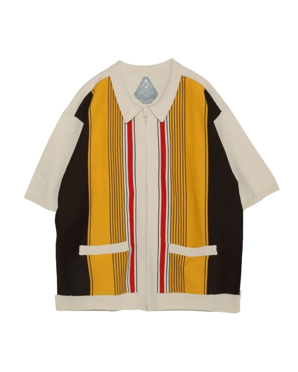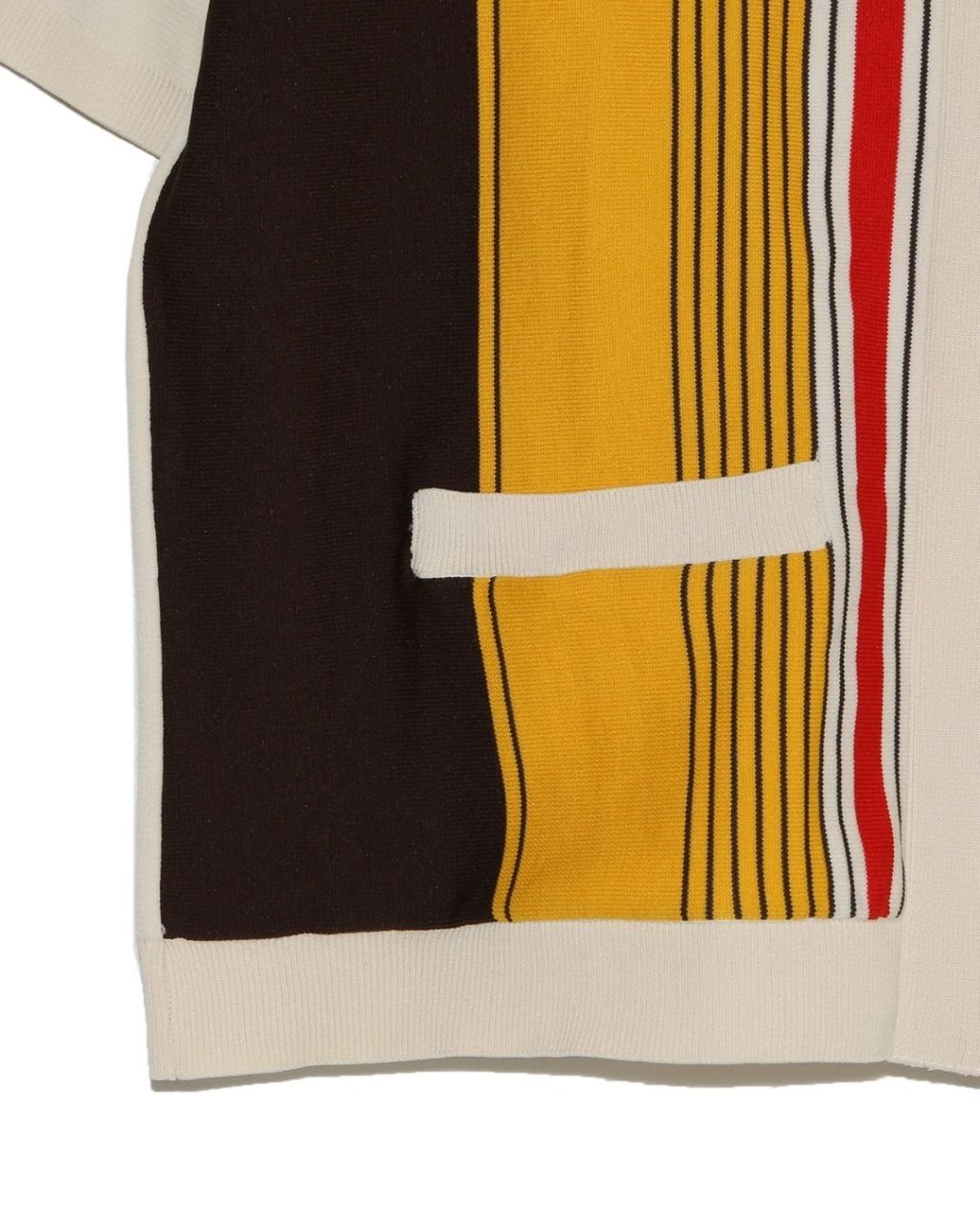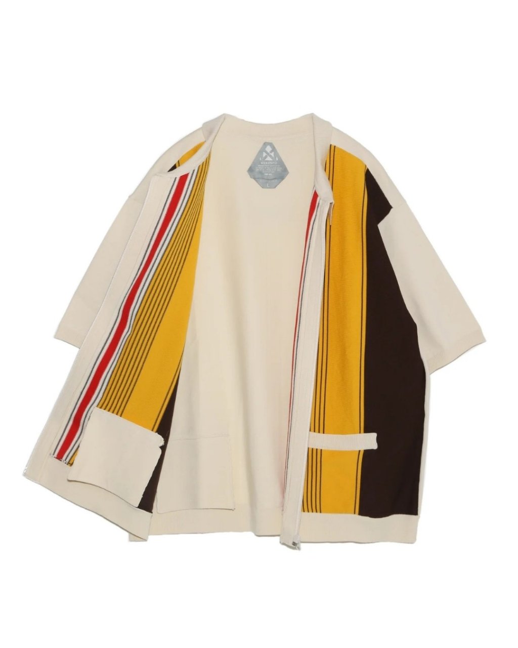 A striped knit cardigan made from multi-functional (water repellent, anti-pilling, UV protection, machine washable, tumbler safe, lightweight, anti-static, made from 10% recycled PET bottles) polyester yarn that is also strong. The coloring and stripes are reminiscent of mid-century California. A piece that combines classic visuals with cutting-edge functional yarns.
