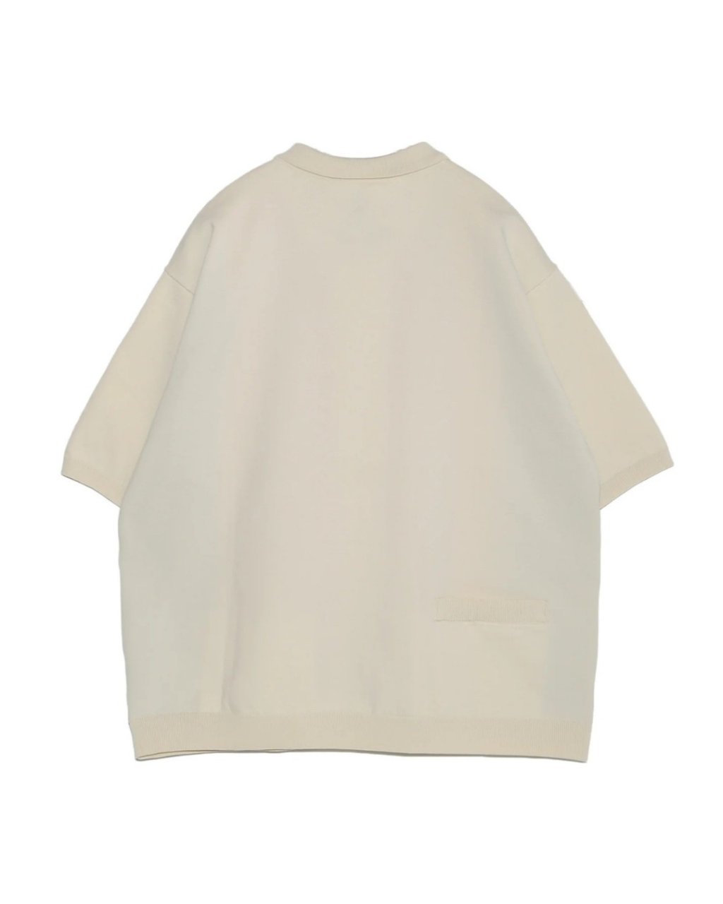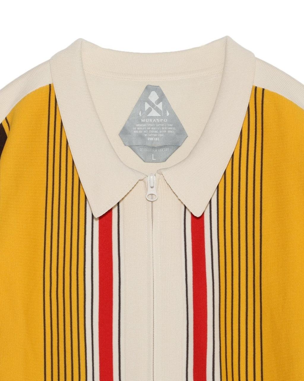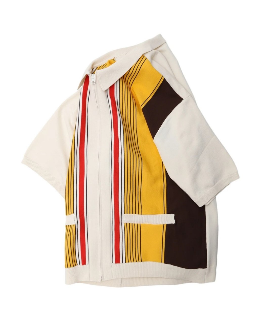A striped knit cardigan made from multi-functional (water repellent, anti-pilling, UV protection, machine washable, tumbler safe, lightweight, anti-static, made from 10% recycled PET bottles) polyester yarn that is also strong. The coloring and stripes are reminiscent of mid-century California. A piece that combines classic visuals with cutting-edge functional yarns.