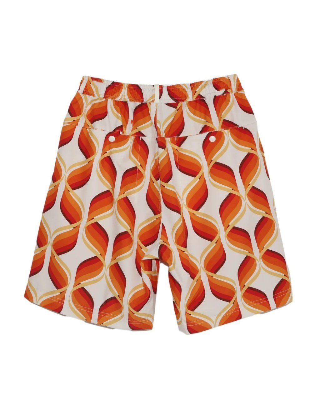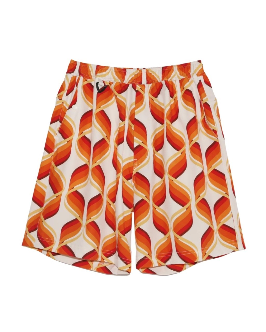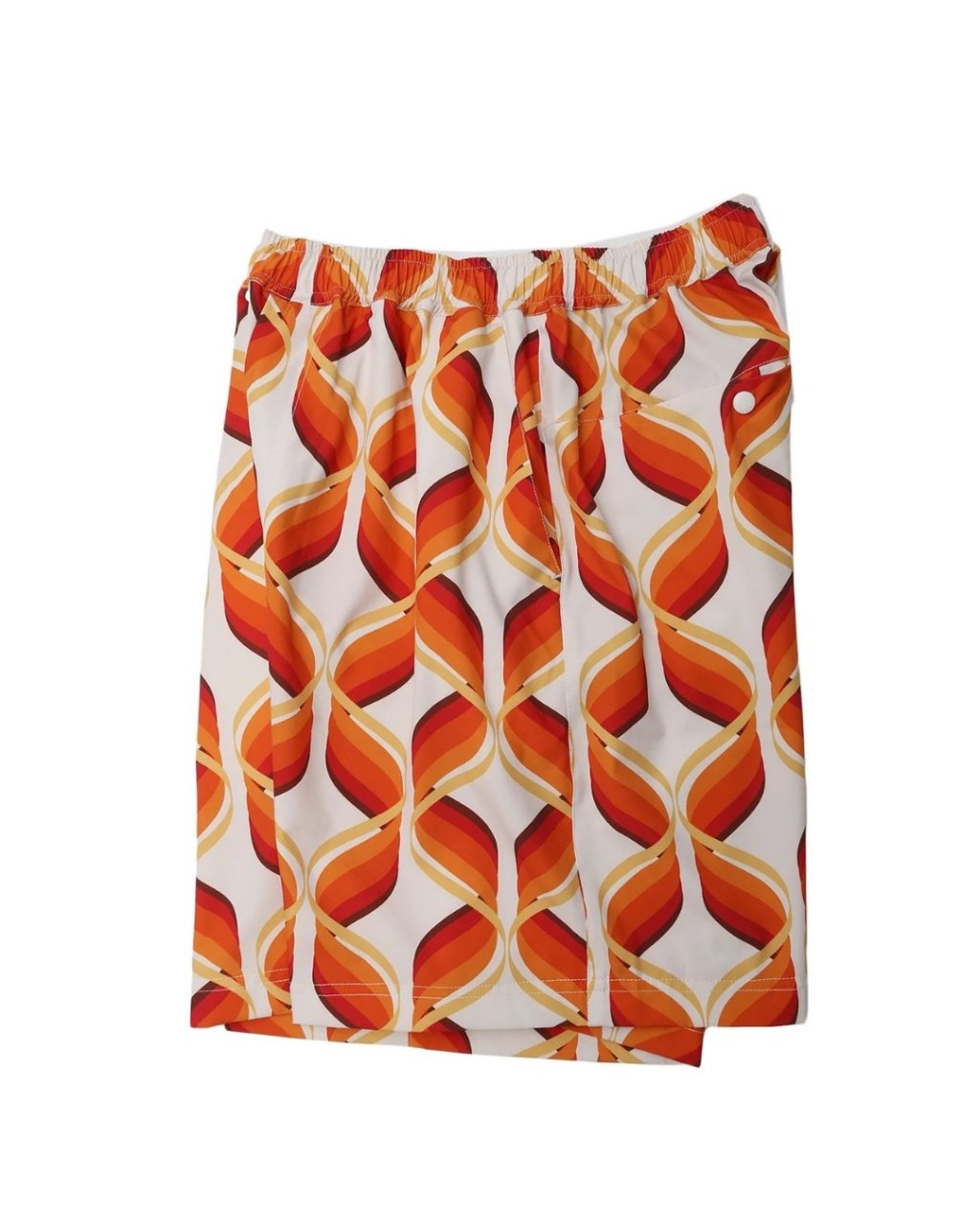 These printed shorts feature an original print on a stretch polyester material used for surf shorts. The functional material is strong, quick-drying, and stretchy, and the original print pattern is inspired by the mid- century era, creating a hybrid finish that combines high-tech material with a classic look. These are comfortable, relaxed-fitting items that can be worn on land or on land.