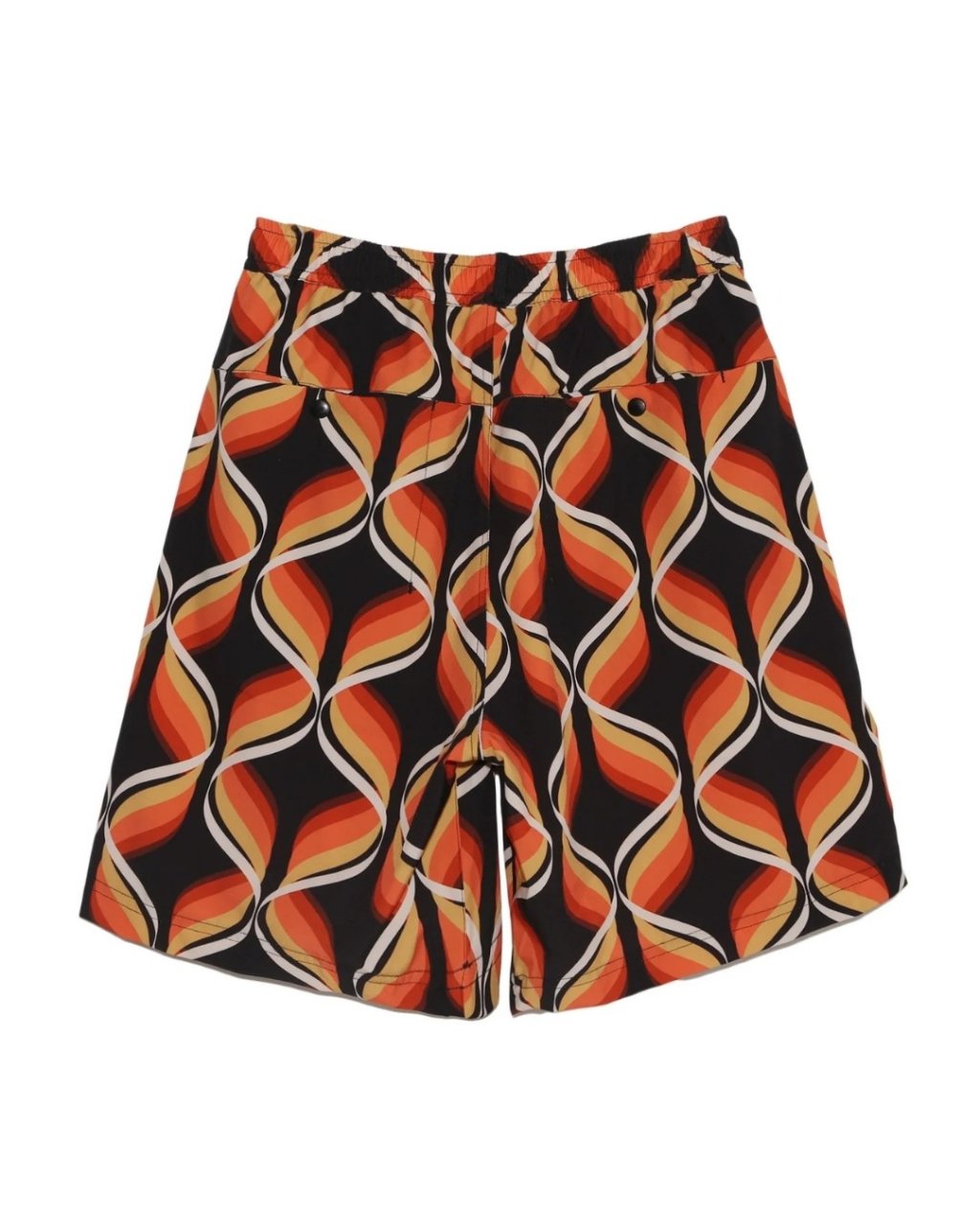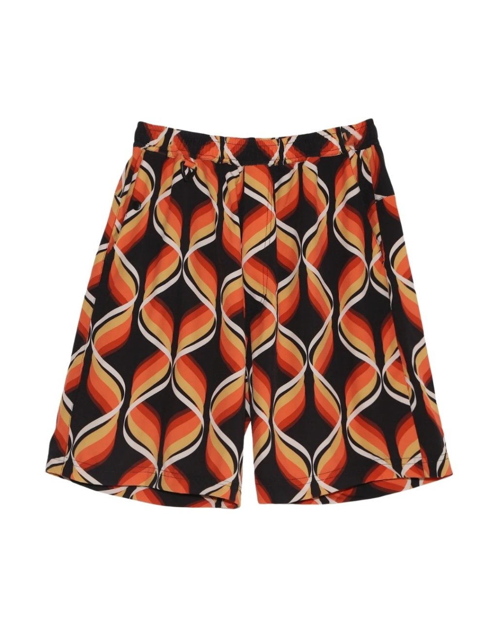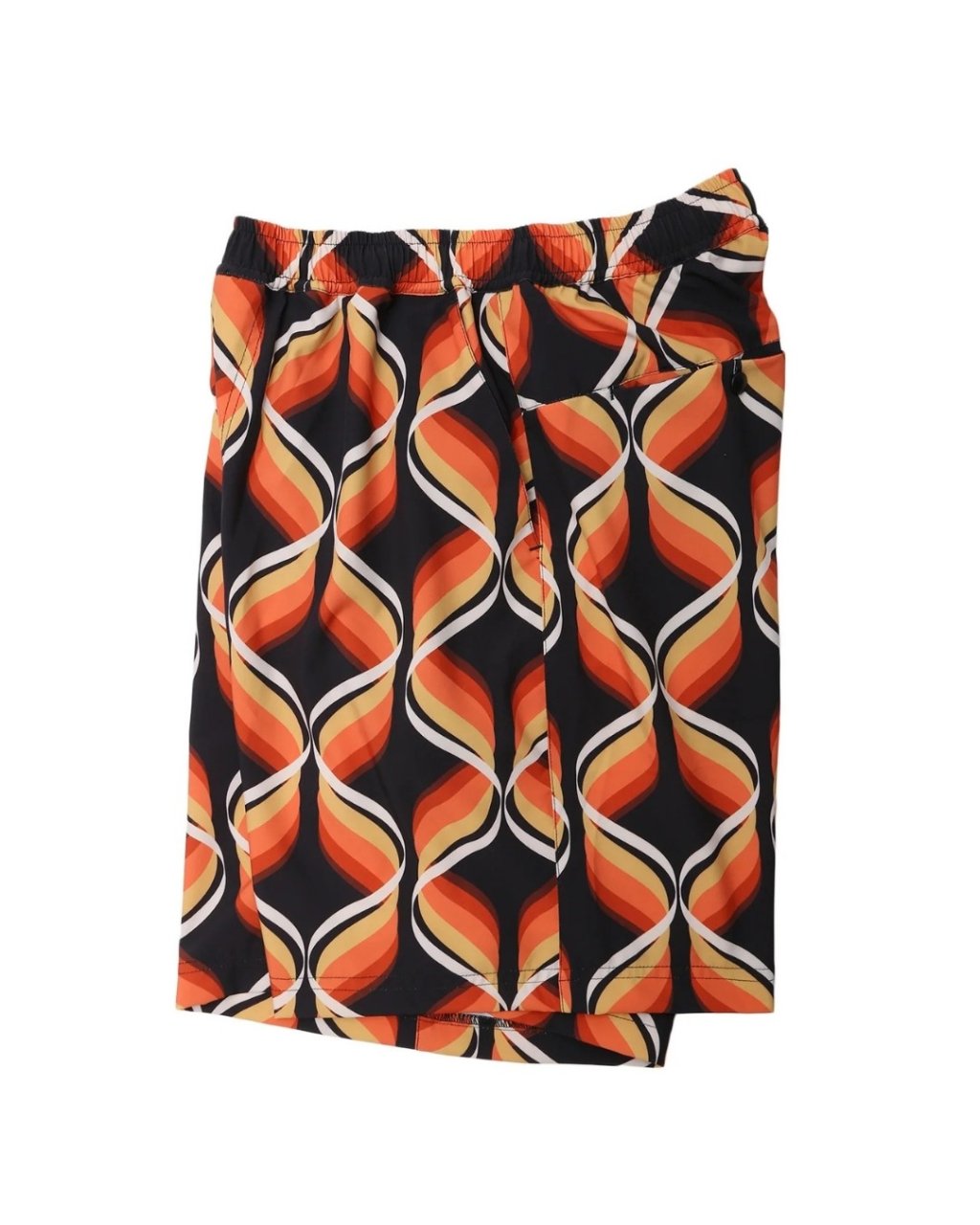 These printed shorts feature an original print on a stretch polyester material used for surf shorts. The functional material is strong, quick-drying, and stretchy, and the original print pattern is inspired by the mid- century era, creating a hybrid finish that combines high-tech material with a classic look. These are comfortable, relaxed-fitting items that can be worn on land or on land.